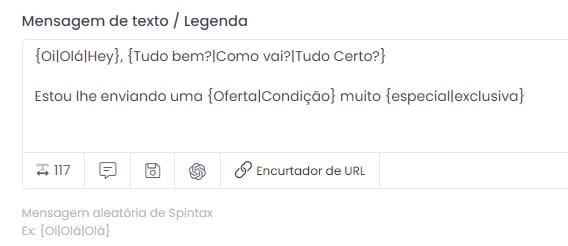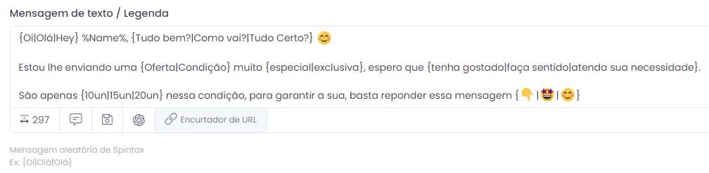 - Exemplo de mensagem: “{Oi|Olá|Hey}, {Tudo bem?|Como vai?|Tudo Certo?}Estou lhe enviando uma {Oferta|Condição} muito {especial|exclusiva}”
